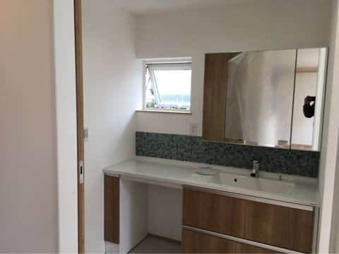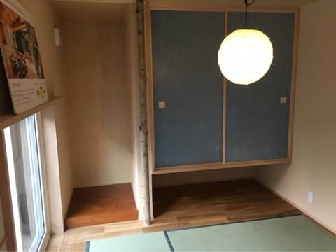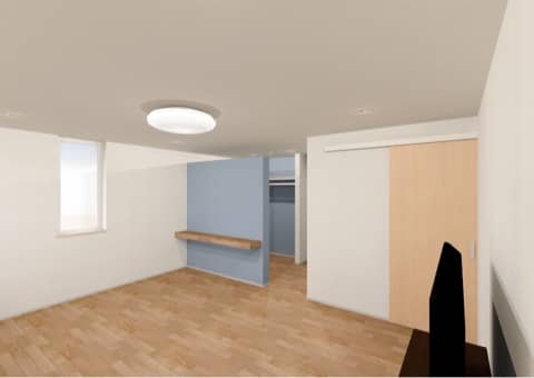 塗り壁のアクセント、押入れの襖、洗面台のタイルに青を使いました。