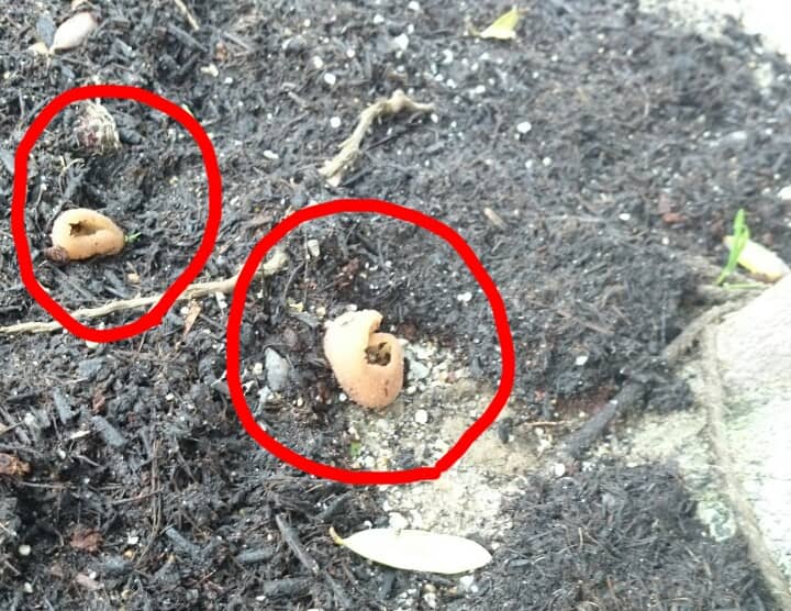お庭のオリーブの土の上に何やら気持ち悪い物体が…。