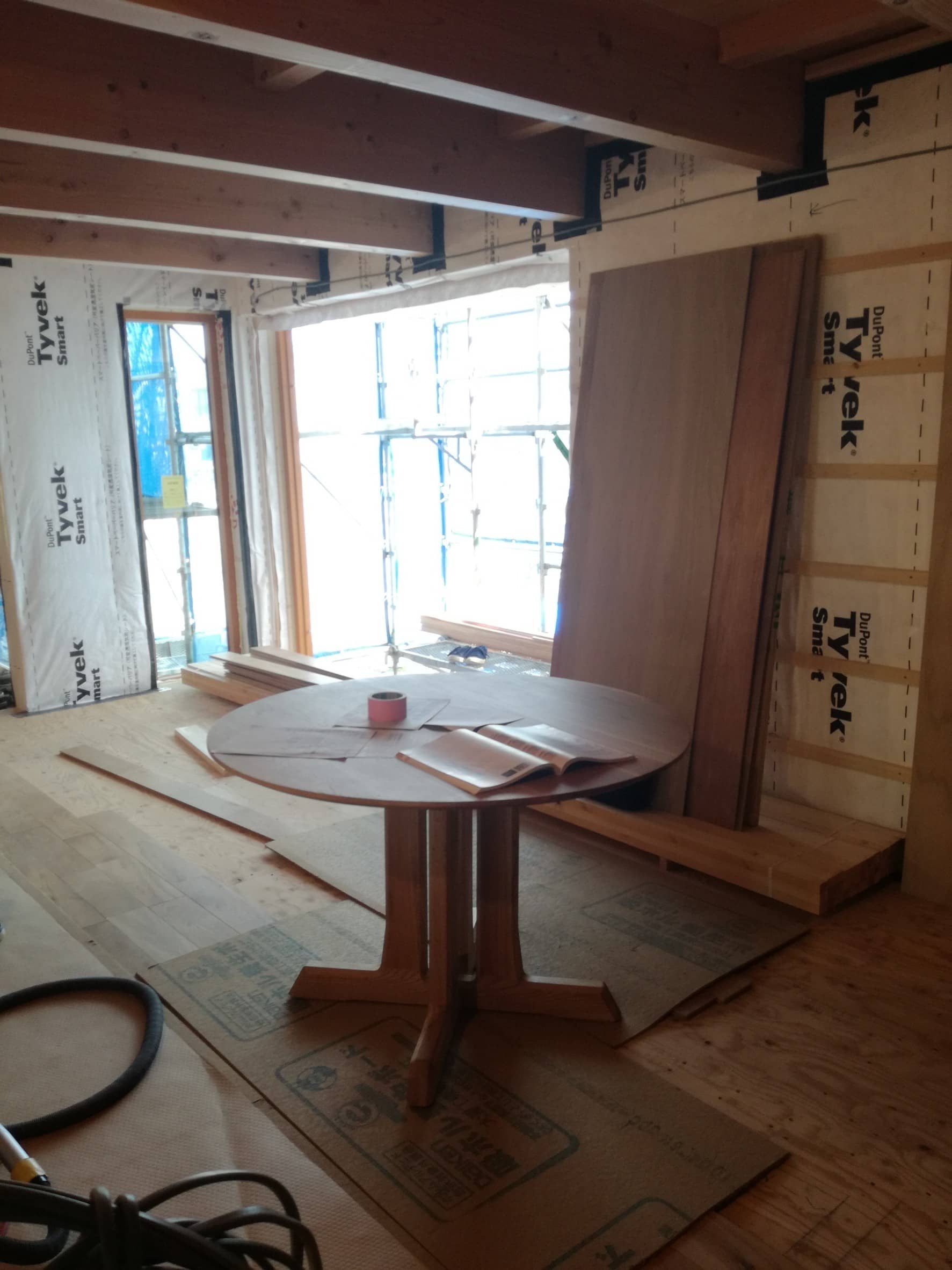 ダイニングテーブルの中心に据える照明の位置を決めきれなかったので、エムズさんのご好意でダイニングテーブルを実際においていただき、壁からの距離感などを実物で体感させてもらいました。