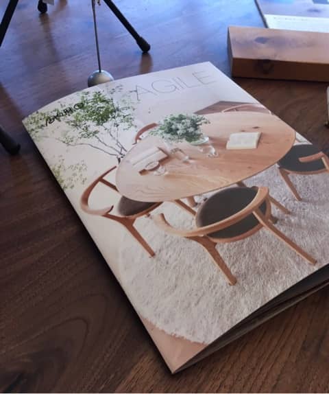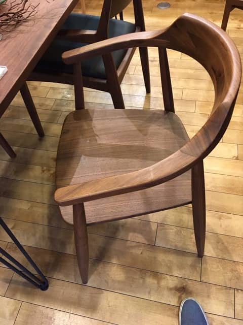 丸テーブルの現物はなかったのですが、オーダーで作れるそうです。テーブルと一緒に探しているアームレストがついている板座のダイニングチェアが沢山ありました。お値段も良い値段です。こちらは木の種類(ブナやタモ、ナラ、クルミなど)からこだわって作っていて、一枚板の机なども作って販売しているそうです。家具一つ一つの肌触りや座りごごちがとても良かったです。