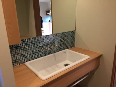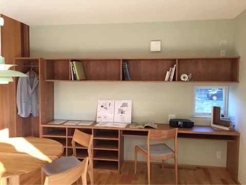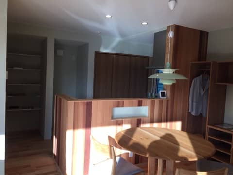 キッチン腰壁のレッドシダーや、壁に大きな造作家具が取り付けられており、目を引きます