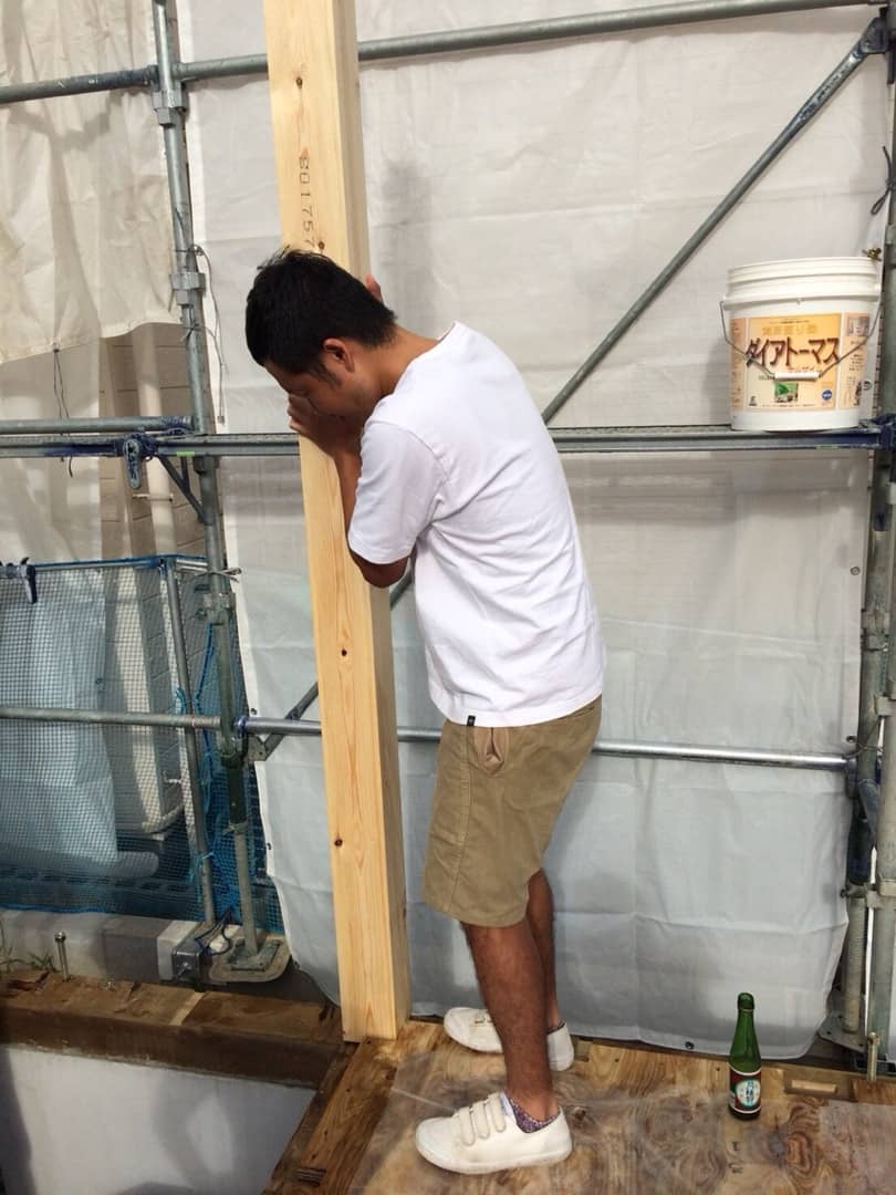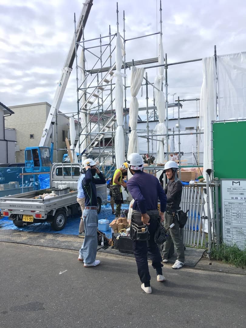 そして朝8時を迎え、11人の精鋭大工さん達、現場監督、設計担当の某S野っちと対面しました。上棟の朝礼では、わたくし何故か緊張していました。今林現場監督から「一言お願いします」と言われて言い放ってしまった言葉が『え、、、M’s史上No.1の施工でお願いします!』完全調子こきました。すぐ反省して手が震え出しました。そしたら真横でそれを聞いていたBBQの時、金魚すくい及びかき氷担当だったイケメン大工さんが、優しいウィスパーボイスで『安心してください』と耳元で囁いてくれました。その一言、スナイパーの如く私の胸を貫きました