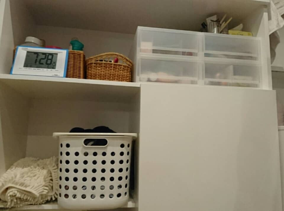 上にも扉があり、バスタオルや洗剤ストックやら。パジャマも下着類も入ってます![]()