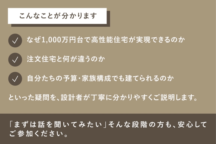 「この価格で、本当に大丈夫?」そんな疑問をお持ちの方にこそ、1,000万円台で実現する高性能住宅の中身を知ってほしい相談会です。 - 建てたあとも、できるだけお金と手間をかけずに暮らしたい方・・・
