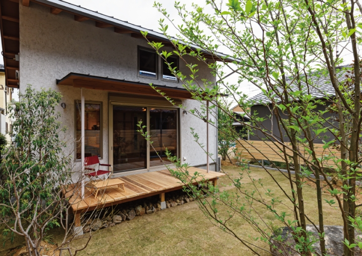 そとん壁のお庭の外には、お庭の緑を眺めながらBBQを楽しめるウッドデッキ。