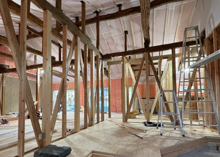 天井裏に隠れていた立派な丸太梁をあらわしに。