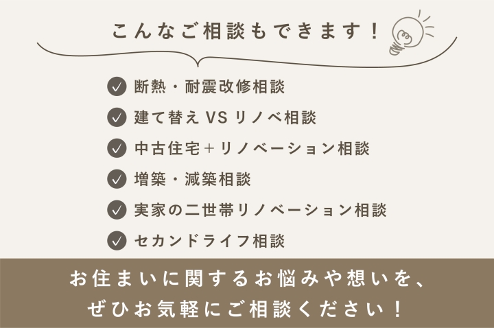 - リノベーションしたいけど、「予算」「暮らしやすさ」「構造」「将来性」に不安を感じている方
