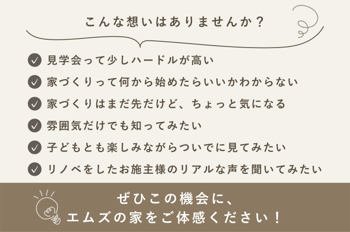 エムズアソシエイツの家づくりについて、ぜひこの機会にご体感ください!