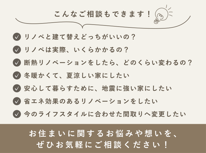 - リノベーションしたいけど、「予算」「暮らしやすさ」「構造」「将来性」に不安を感じている方