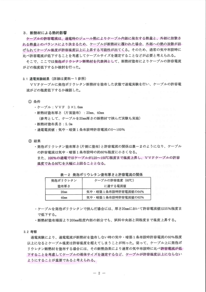 総括して、VVFケーブルが断熱材に覆われると発生した熱の放散が妨げられるため、断熱材の熱的影響を考慮しないと、ケーブル温度が教養温度以上に上昇する可能性がある。