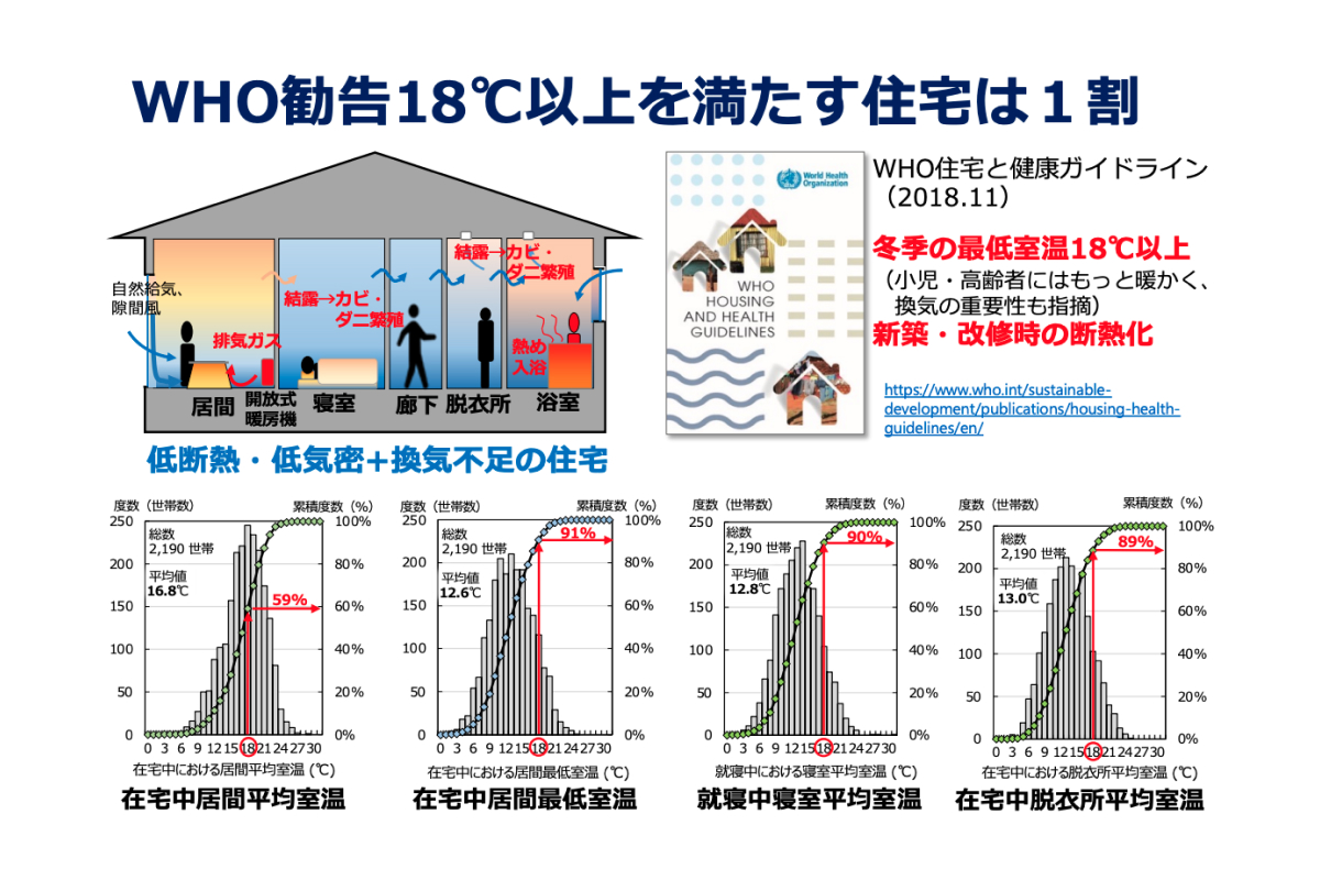 | 在宅中の最低室温が18℃未満の家 | 全体の91%(この場合の平均室温はわずか12.6℃) |