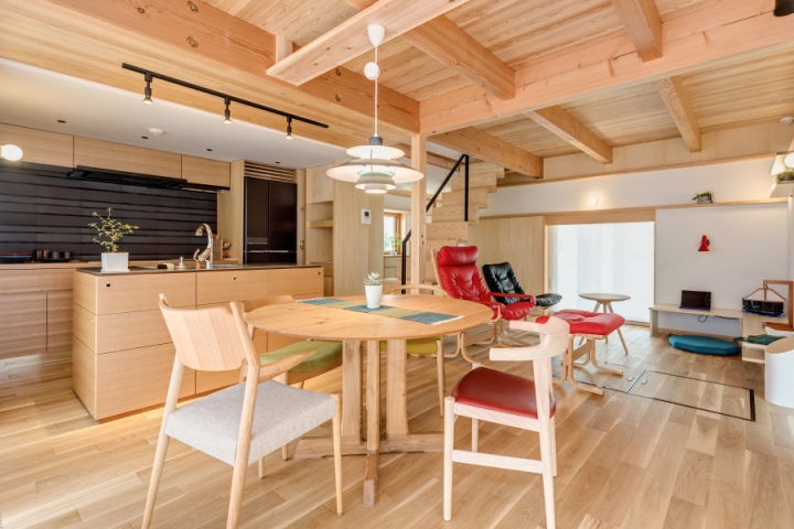 室内空気にやさしい素材選びで、家族の健康を守る住まいを実現しました。家族が直接触れる部分には、壁に自然素材の塗り壁を、床に本物の無垢材を使用。これにより、心地よい空気感と清潔な室内環境が生まれます。