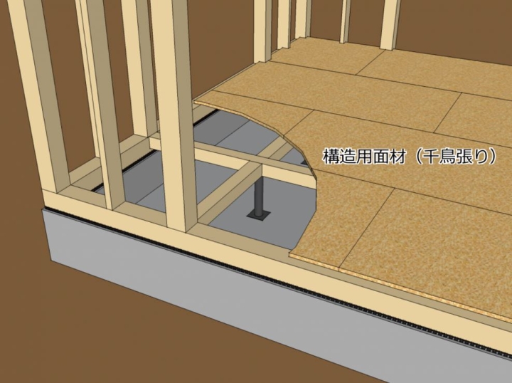 上の写真は現在のほとんどの住宅で採用されている剛床工法とよばれるもの。
