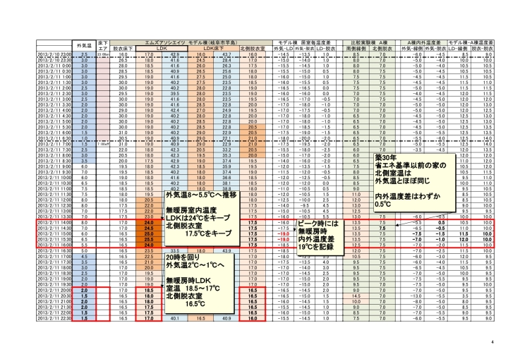 外気温とほぼ等しい室内温度となることがわかる。対して、高気密高断熱仕様の室内では外気温が一桁に下がっても、無暖房状態で室温18℃前後をキープしていることがわかる。