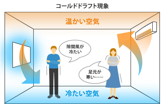 エアコンで温めた空気は上昇し天井付近へ、性能の脆弱な窓からは熱が室外に逃げ、コールドドラフト現象を誘発します。