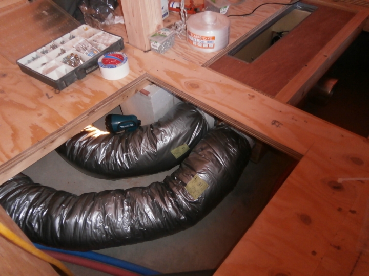 階段下や、造作家具のデッドスペース等、床に開口(エアコン用の穴)を空けてエアコンの送風を床下に送り込む場所が必要になります。