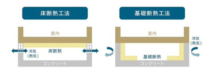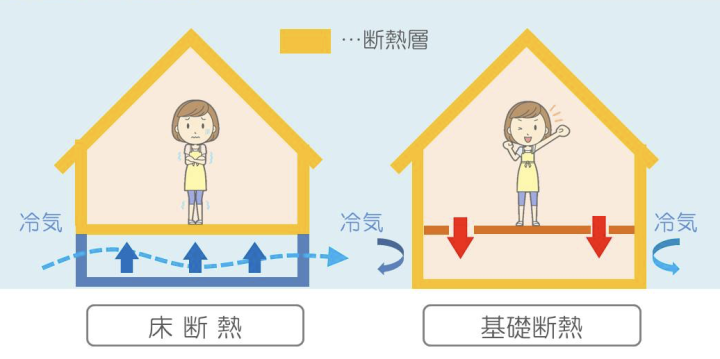 その点、基礎断熱では、気密も断熱も隙間なく施工できるので、足元の寒さは感じられなくなり、エアコンの効きも全くちがうものになります。