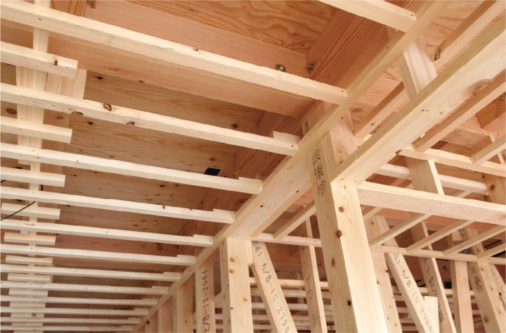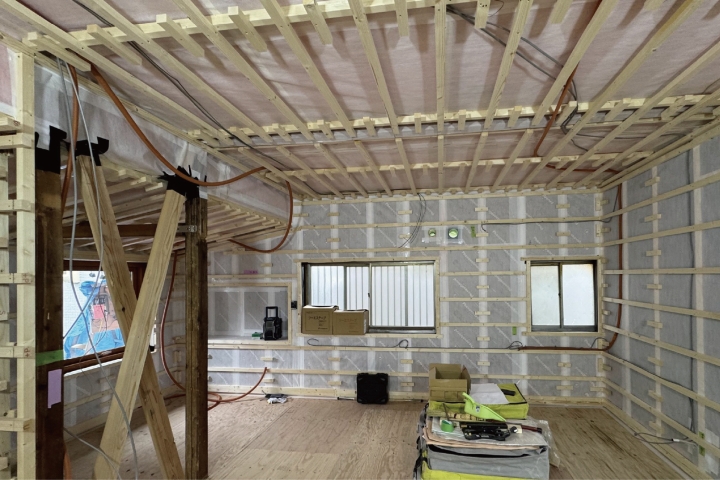 壁・天井がつく前のスケルトン現場を公開。断熱材や耐震補強を実際に確認できます。