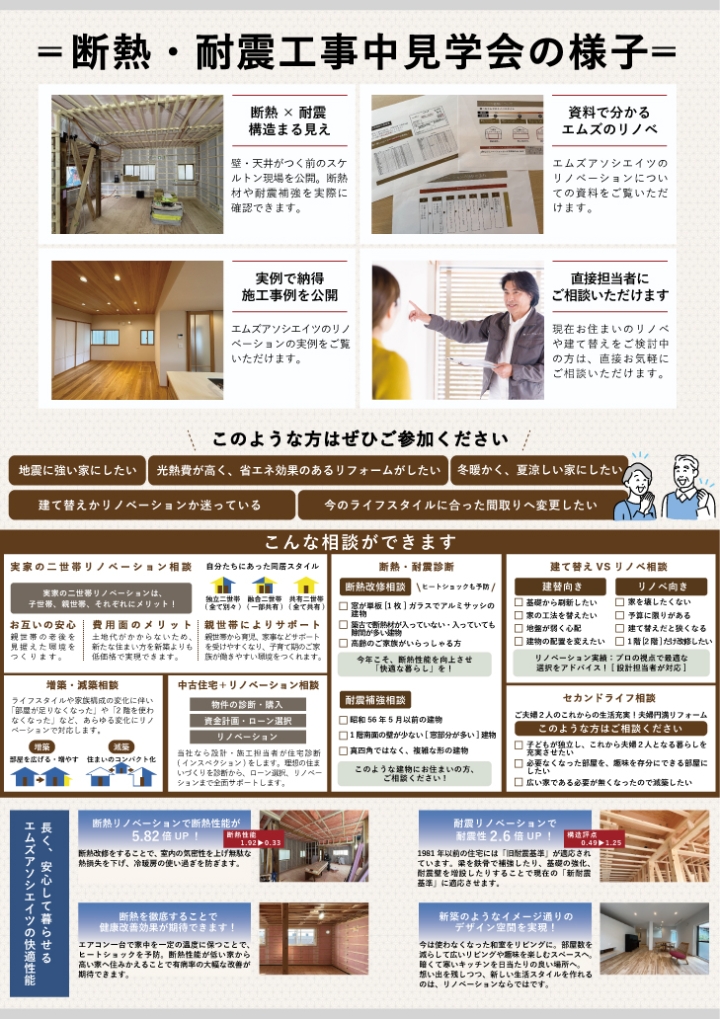 “リノベーションでここまで変わる!?”を、完成すると見えなくなる構造部分の見学を通して耐震・断熱改修の現場を是非ご体感ください。