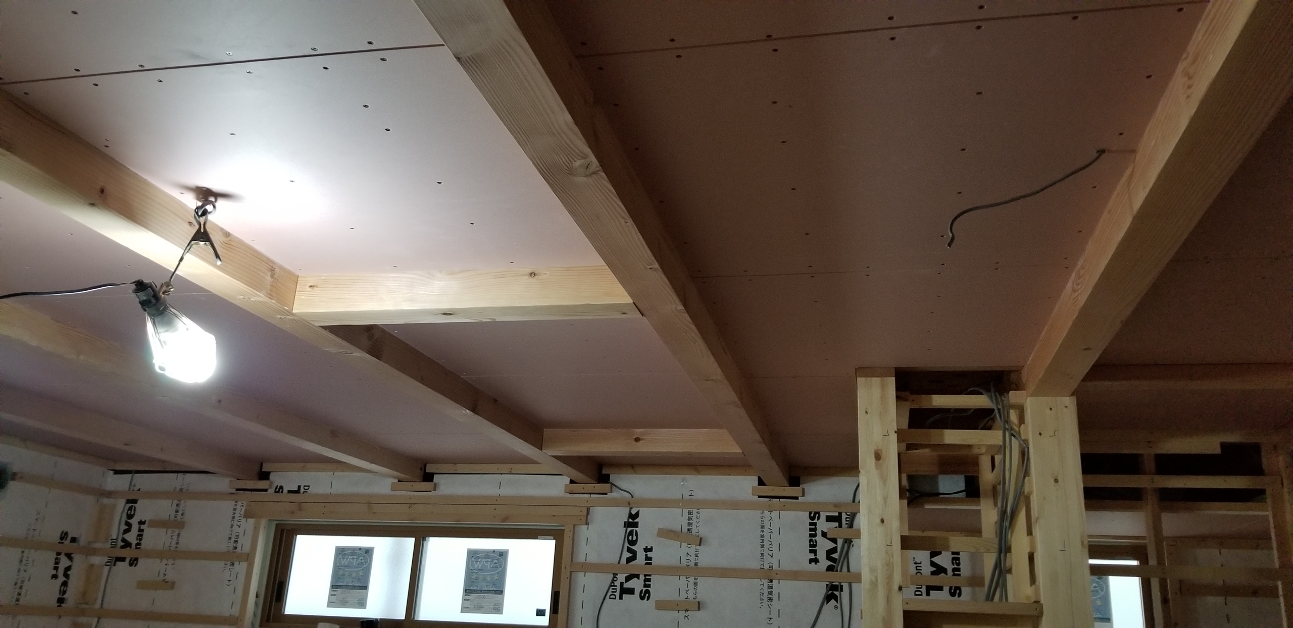 ↓ 2階の天井のプラスターボード、はりました。