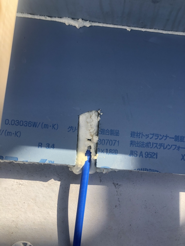 発泡ウレタンを施工してこの部分の断熱欠損がないようにしています。