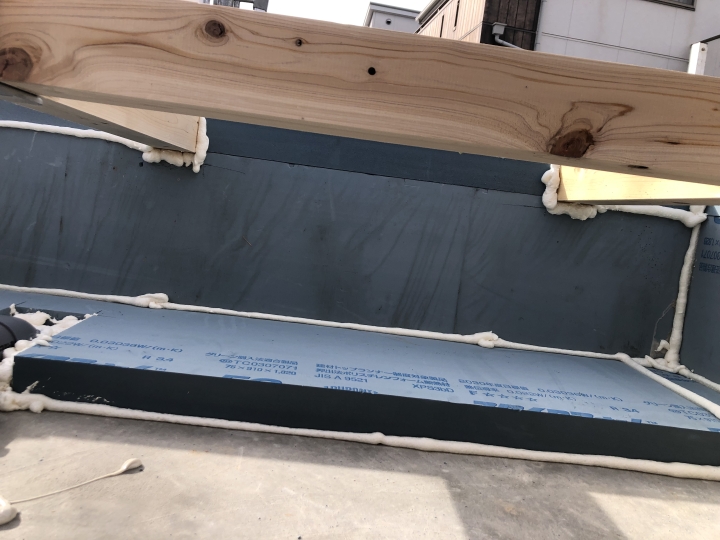 ジョイントにできた隙間には写真のように発砲ウレタンを施工して、断熱欠損がないようにしています。