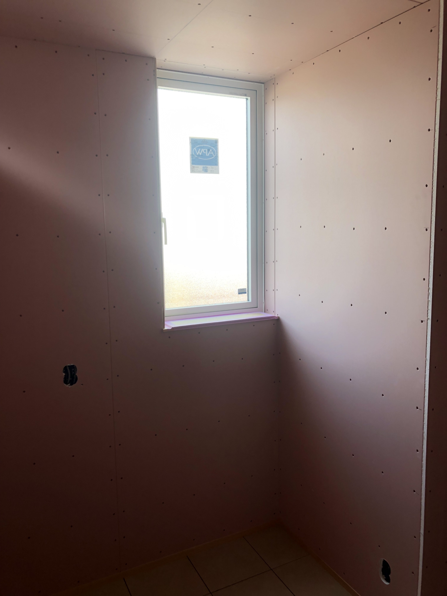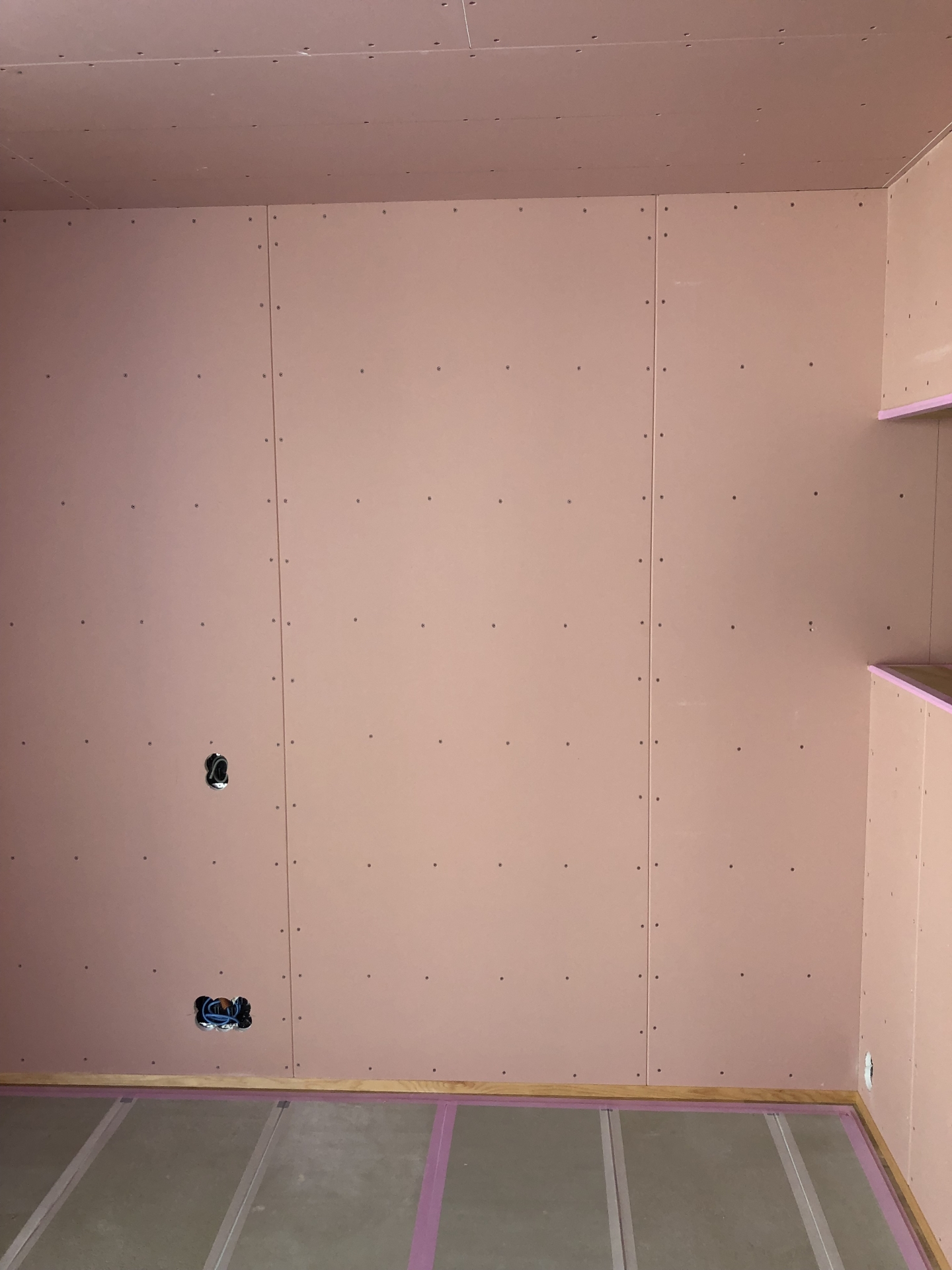 こちらの写真に写っているのが天井のプラスターボードを施工したものとなっています。