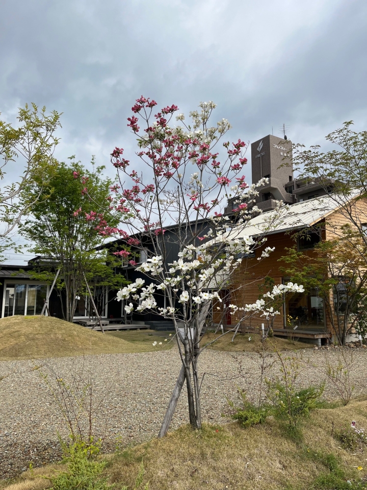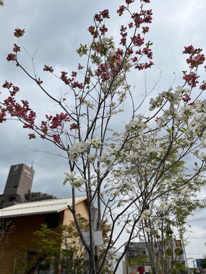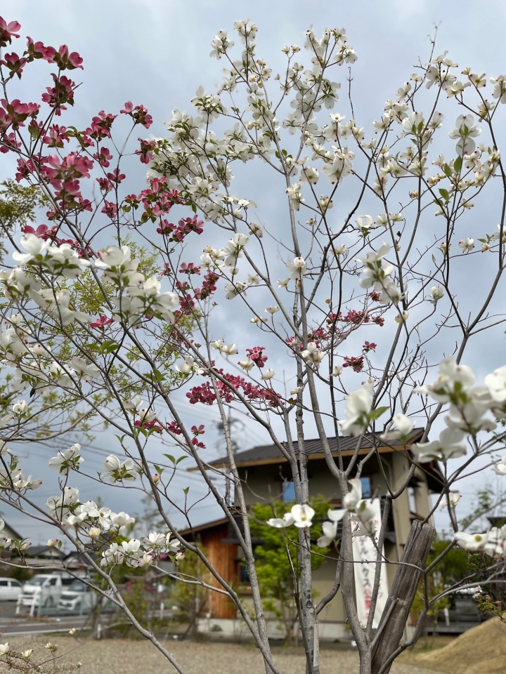 ピンクの花と白色の花が同じ木から咲いています。すごいですね。