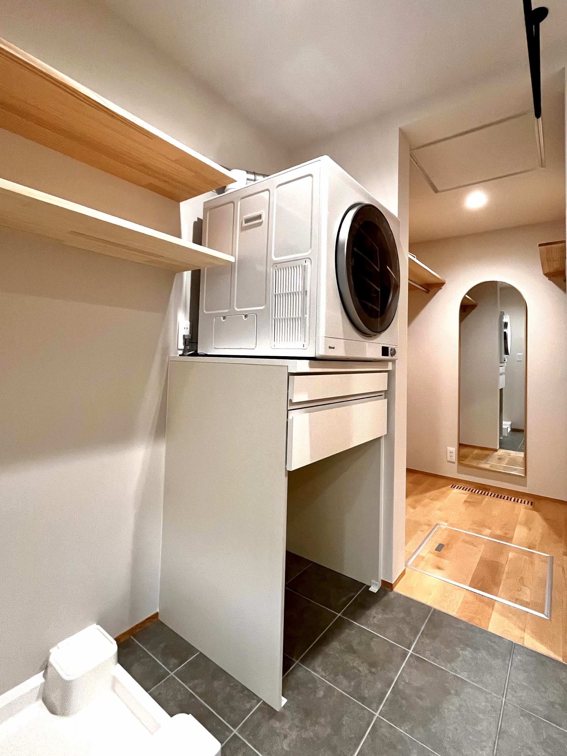 脱衣室には乾太くんを設置しました。乾太くんは洗濯機の横置きが使い勝手や排気口のメンテナンス上も良いかと思っています。
