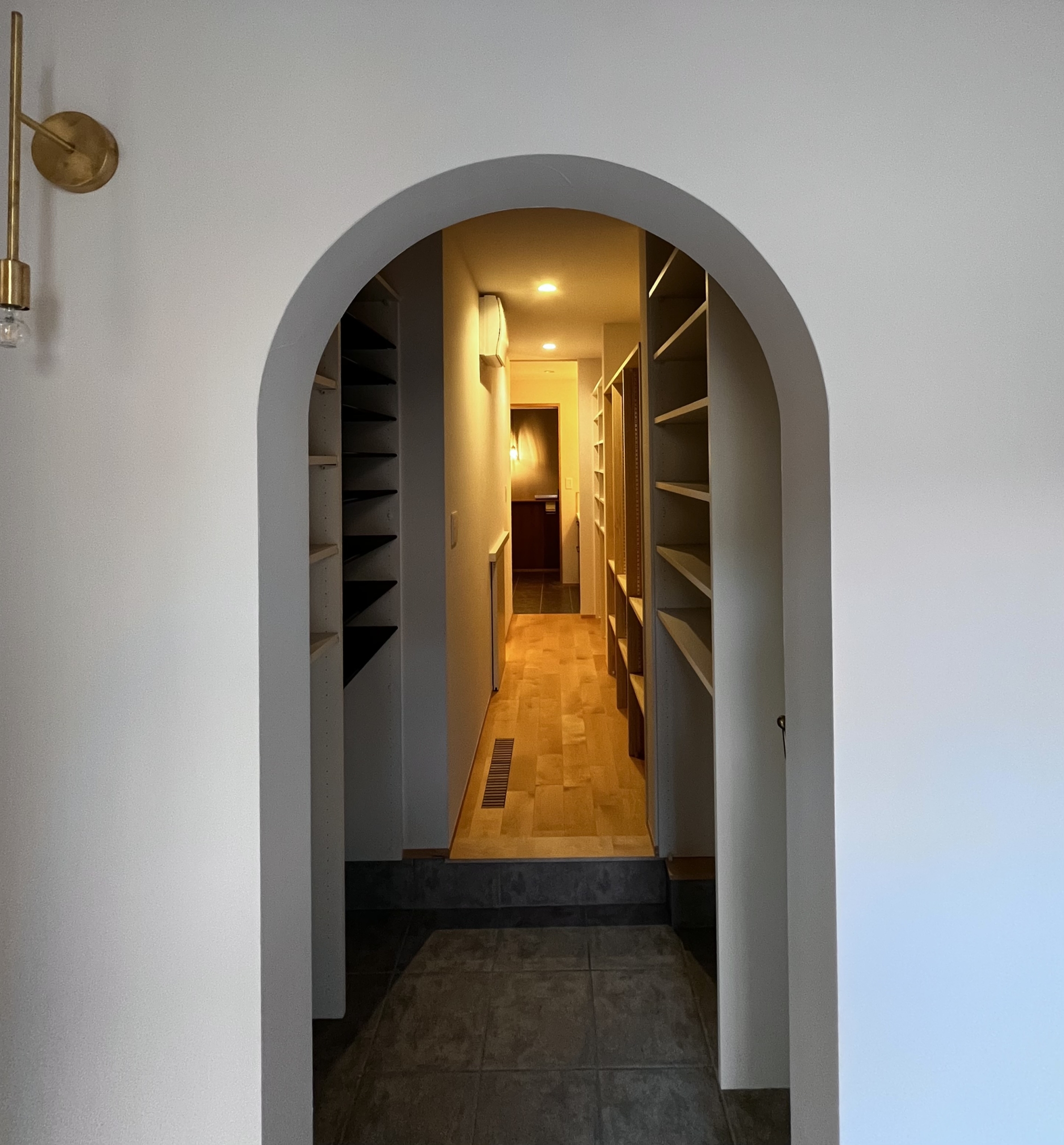 入口はR形状にして、収納棚もたくさん作りましたので、ここでも大工さんが大活躍してもらいました。