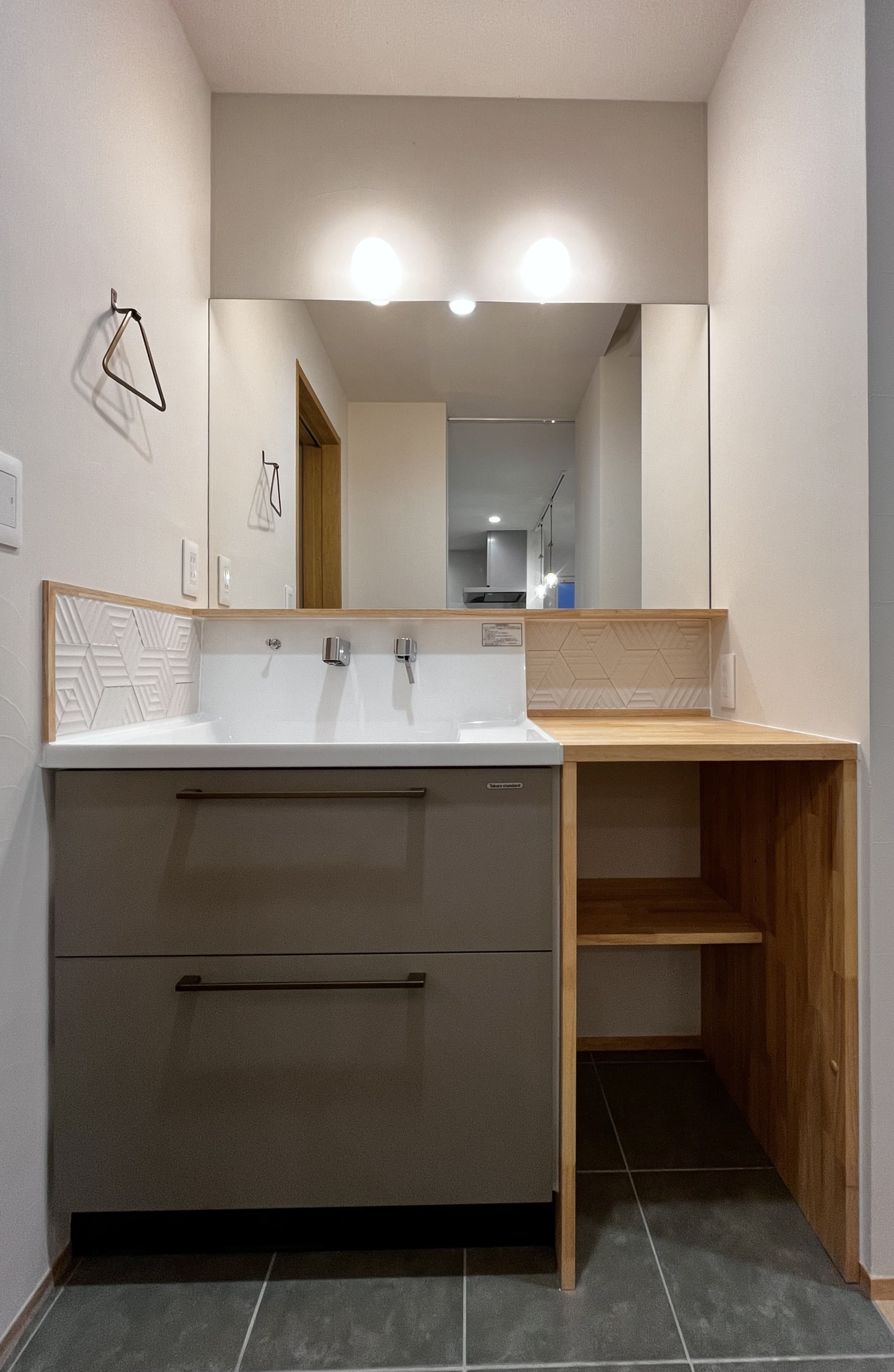 洗面化粧台は脱衣室とは分けて独立させています。洗面化粧台は既製品(タカラ)を採用していますが、カウンターや鏡は造作していますので、それだけで降る造作感が出ていますね。大工さん・鏡屋さん・タイルやさん・電気屋さんの共同作業により出来ています。