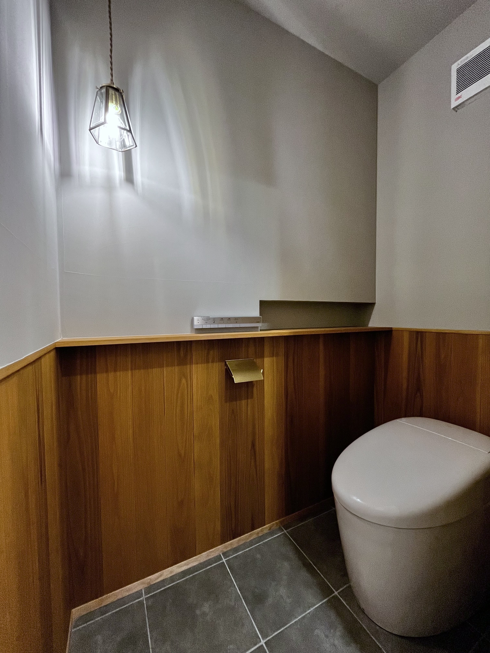 トイレの腰壁には板を張りました。お客様が選ばれた真鍮のペーパーホルダーとも合っています。