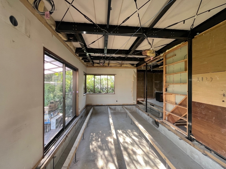 構造の梁の上にはALCという軽量気泡コンクリートで出来たパネルが貼られていたため、木造に比べて配線ルートが難しく現場で電気屋さんとルートの打合せが必要でした。