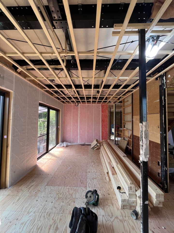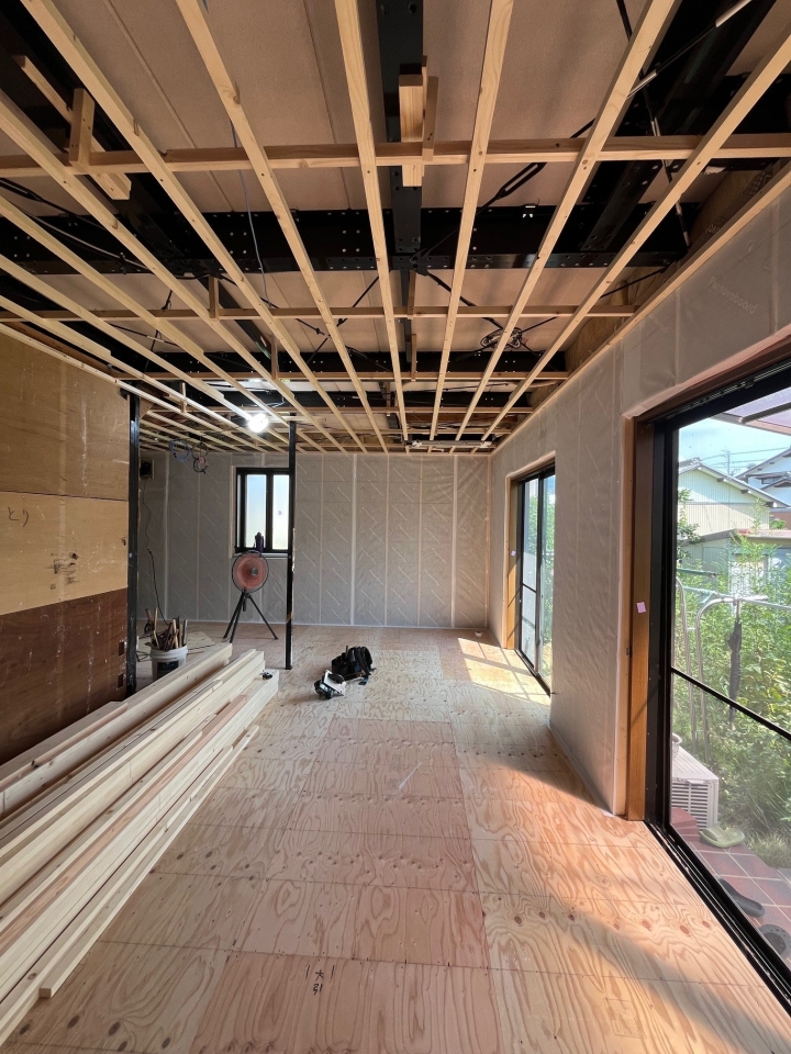 床の部分は断熱を入れ直し新しく合板の床も貼ってあります。壁の断熱材は新築とは違いフェノールフォームというボード状の断熱材を使っています。