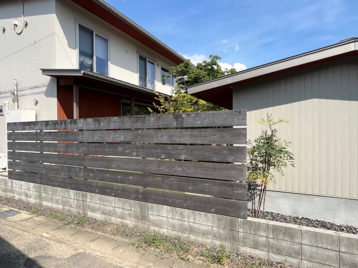 木製フェンスもいい色に変わっていました。フェンスの右に見えるナンテンは移植したもので、最初弱っていたのですが元気だったので嬉しかったです。