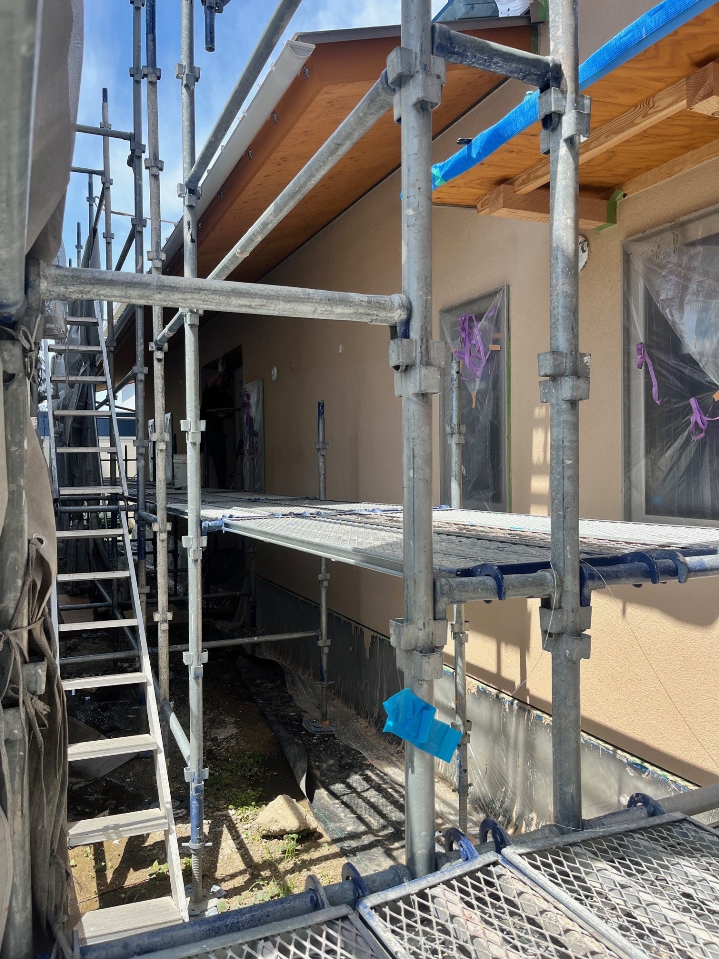 お客様との外構打合せで現場にお邪魔した際に外壁の塗壁工事の作業に立ち会う事が出来ました。