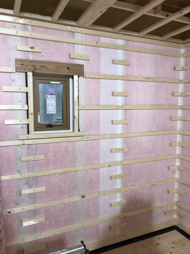 またこちらも下地の間に別の下地材を挟むことで、天井と同じでプラスターボードのビスピッチが150ミリになるようにしています。