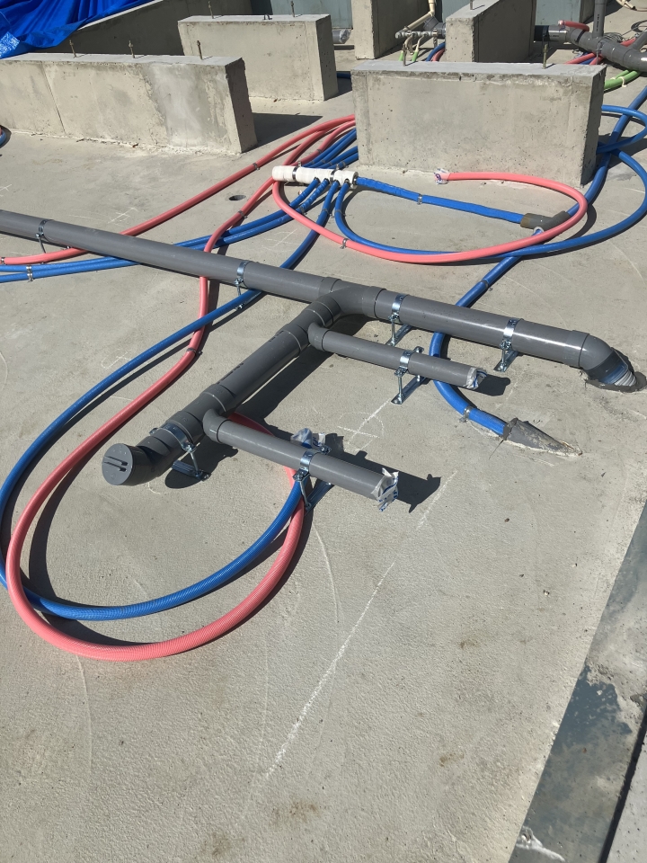 写真や目視では伝わりにくいと思いますが、水は高い位置から低い位置へ流れていくので排水管も勾配をとっての施工となります。