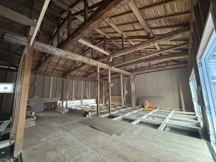 大引きが組まれ、一部床の断熱材が入れられ、床の下地まで施工されています。