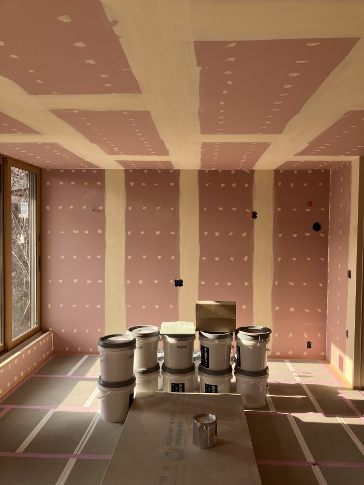 1階部分はというと、天井は吹付ではなく鏝仕上げとなるので今後使用する材料が今か今かと出番待ちです。