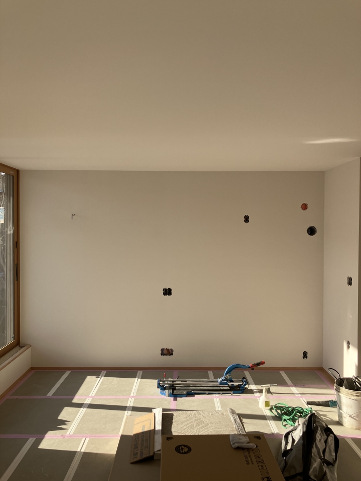 一階は天井+壁仕上げも完了です。
