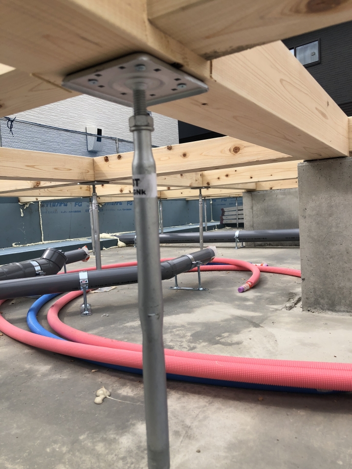 床下から大引きを支え、家鳴りや床の弛みを防ぐためにも、鋼製束はしっかり固定して施工しています。