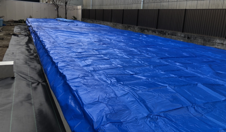 養生シートによる養生の次は、ブルーシートによる養生をして土台への養生は終了になります。