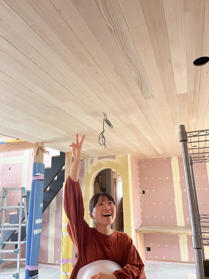 天井の板張りは暖かみがあり、まだ完成していないのに落ち着いた雰囲気に包まれていました。