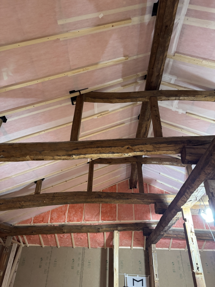 屋根断熱を採用されたようで、古民家ならではの風情ある柱と梁が活かされていてすごく素敵です✨