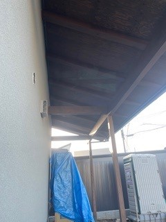 南面は室内の天井に延長して板張りが飛び出しています。