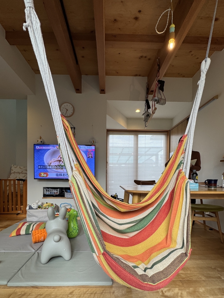 天井は梁あらわしなっていて、クライミングのトレーニング用品やハンモックが吊り下げられていました!!