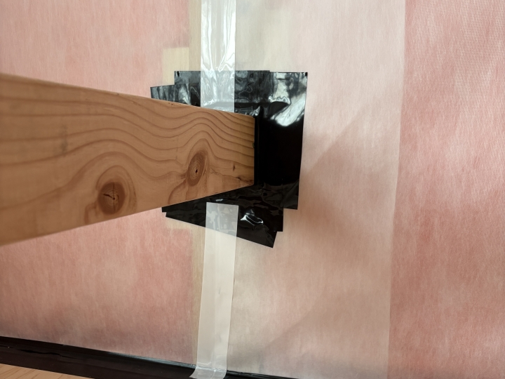 木材は、湿気によって収縮するので、木材部分には、粘着性が強く、追従性のある黒の気密テープを使うことで、木材が多少収縮してもしっかり密着して隙間を無くしてくれます。