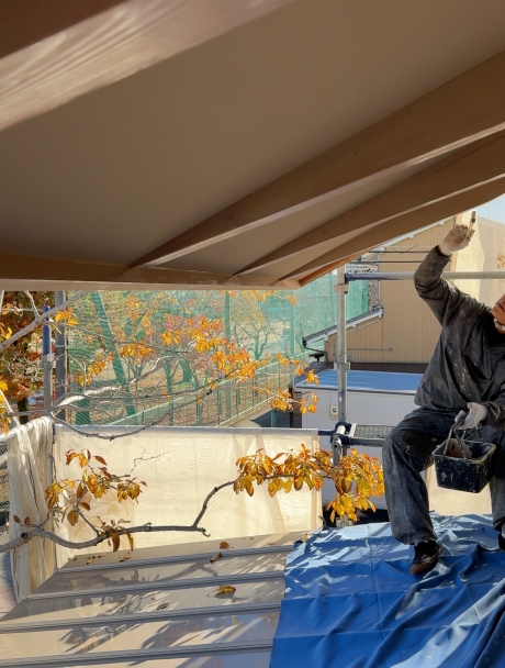 エムズアソシエイツの「登り梁の塗装」では、一度塗りをして木の自然の色味を活かしながら仕上げていきます。