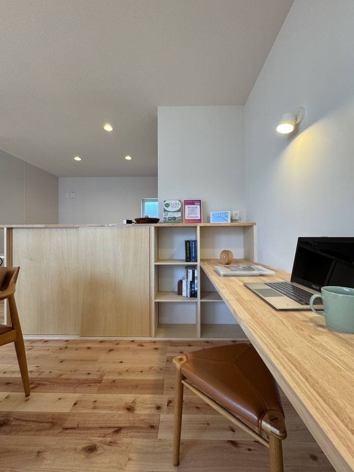 カウンターから続く本棚が統一感があって、ステキです。造作家具の醍醐味ですね。